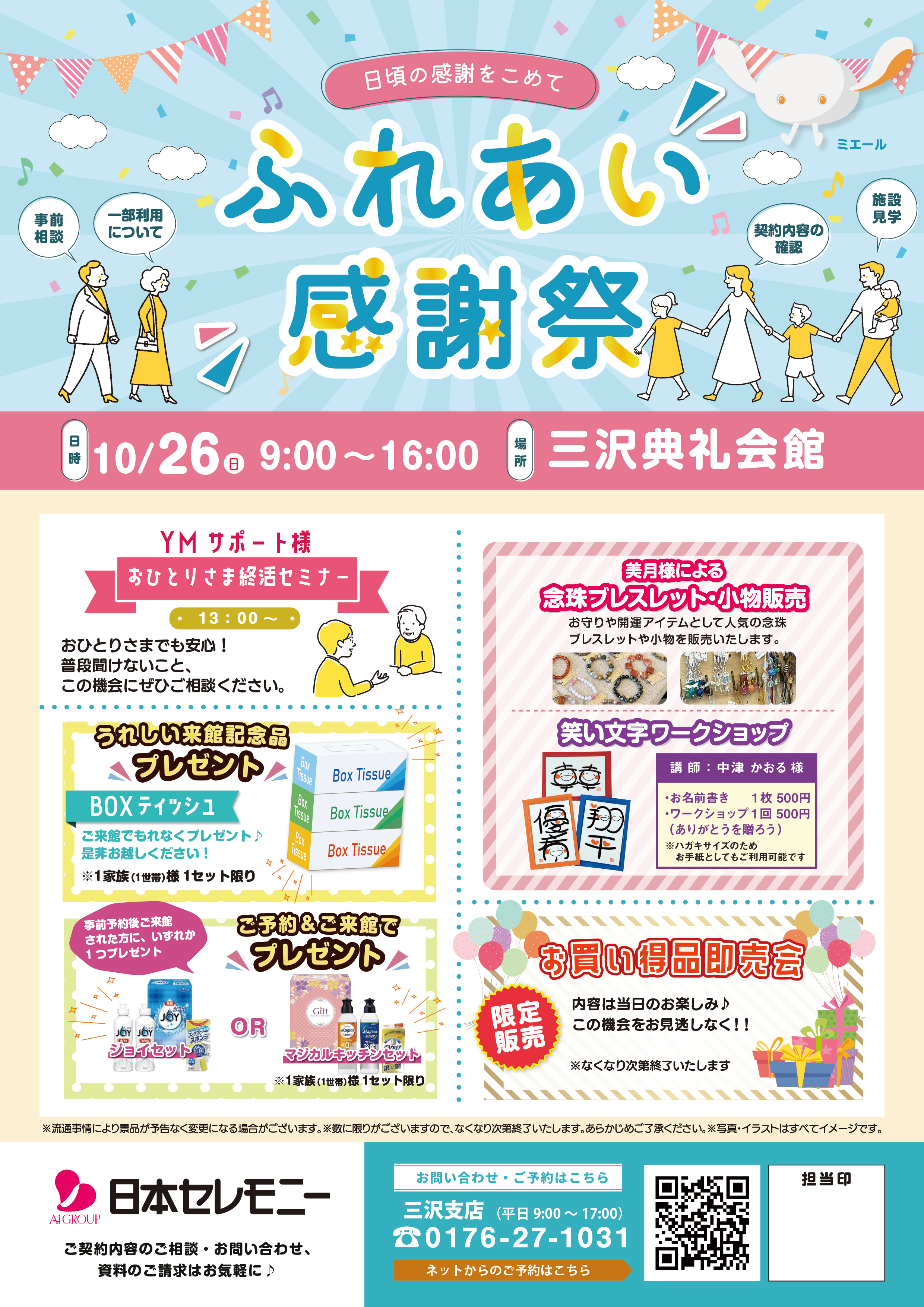 10/26(日)9:00~16:00 三沢典礼会館(三沢市大字三沢字上屋敷163-10 TEL0176-58-7150) にて
