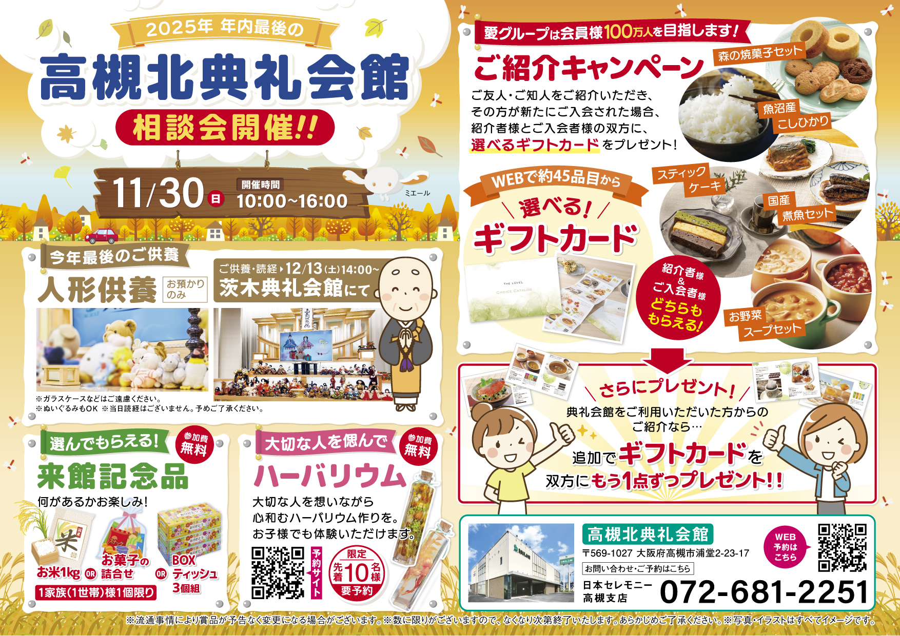 11/30(日)10:00~16:00 高槻北典礼会館(高槻市浦堂2-23-17 TEL072-688-7500) にて