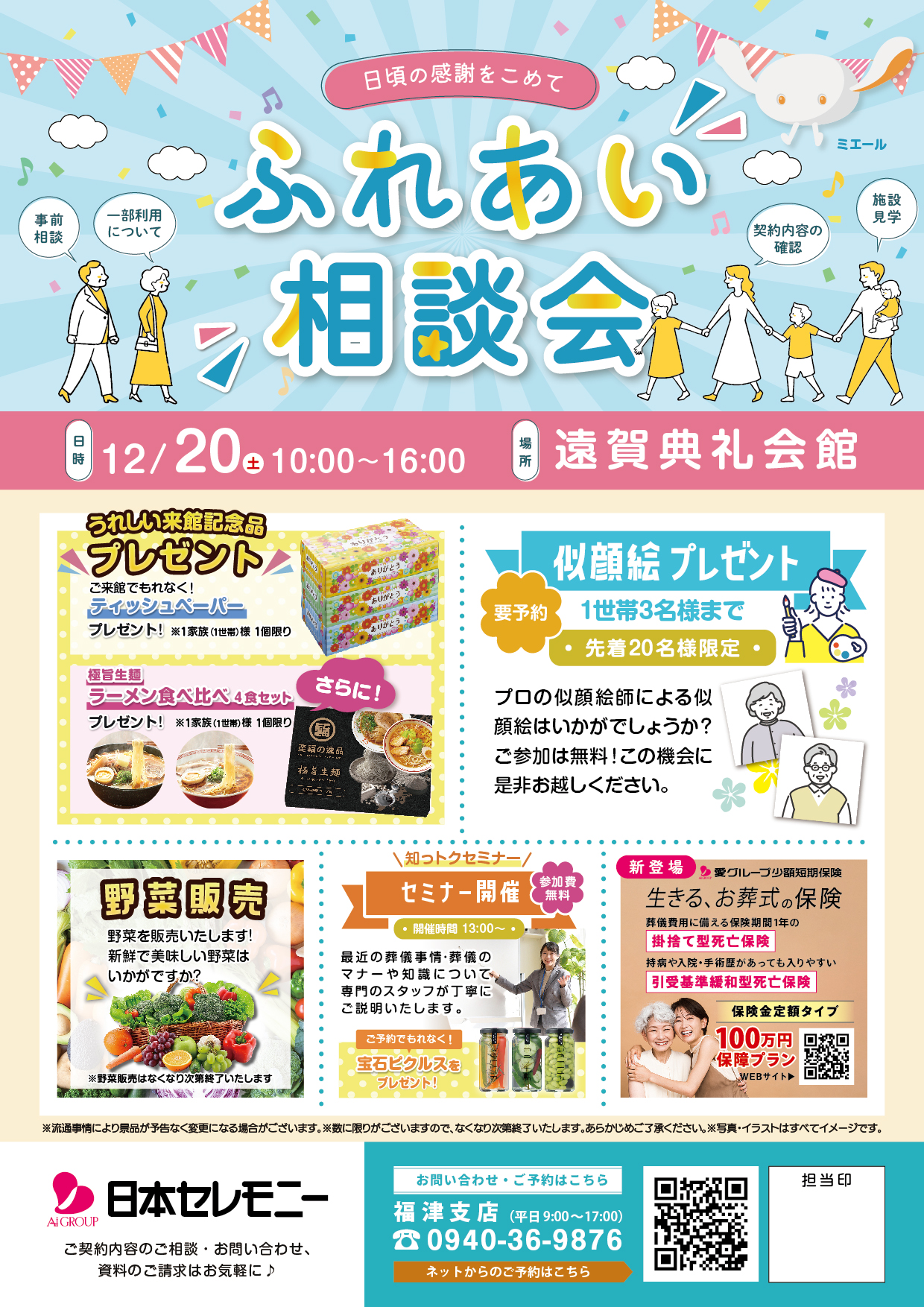 遠賀典礼会館(遠賀郡遠賀町大字今古賀525番地の1 TEL093-291-3555) にて『ふれあい相談会』を開催いたします。
