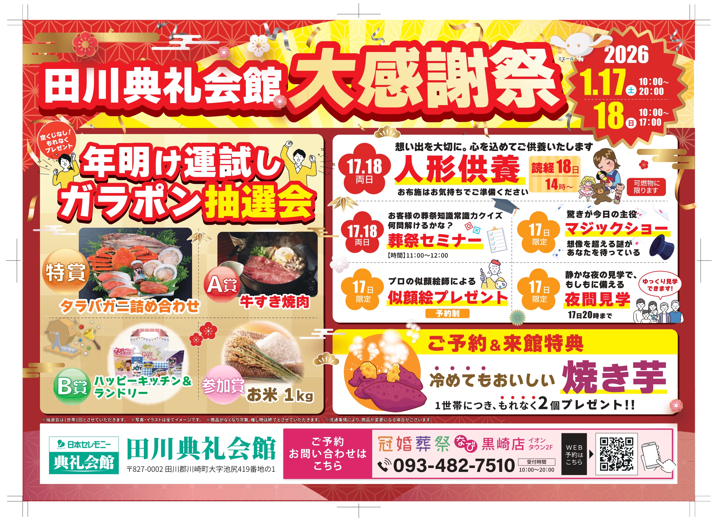 田川典礼会館(田川郡川崎町大字池尻419番地の1 TEL0947-46-3399) にて『大感謝祭』を開催いたします。
