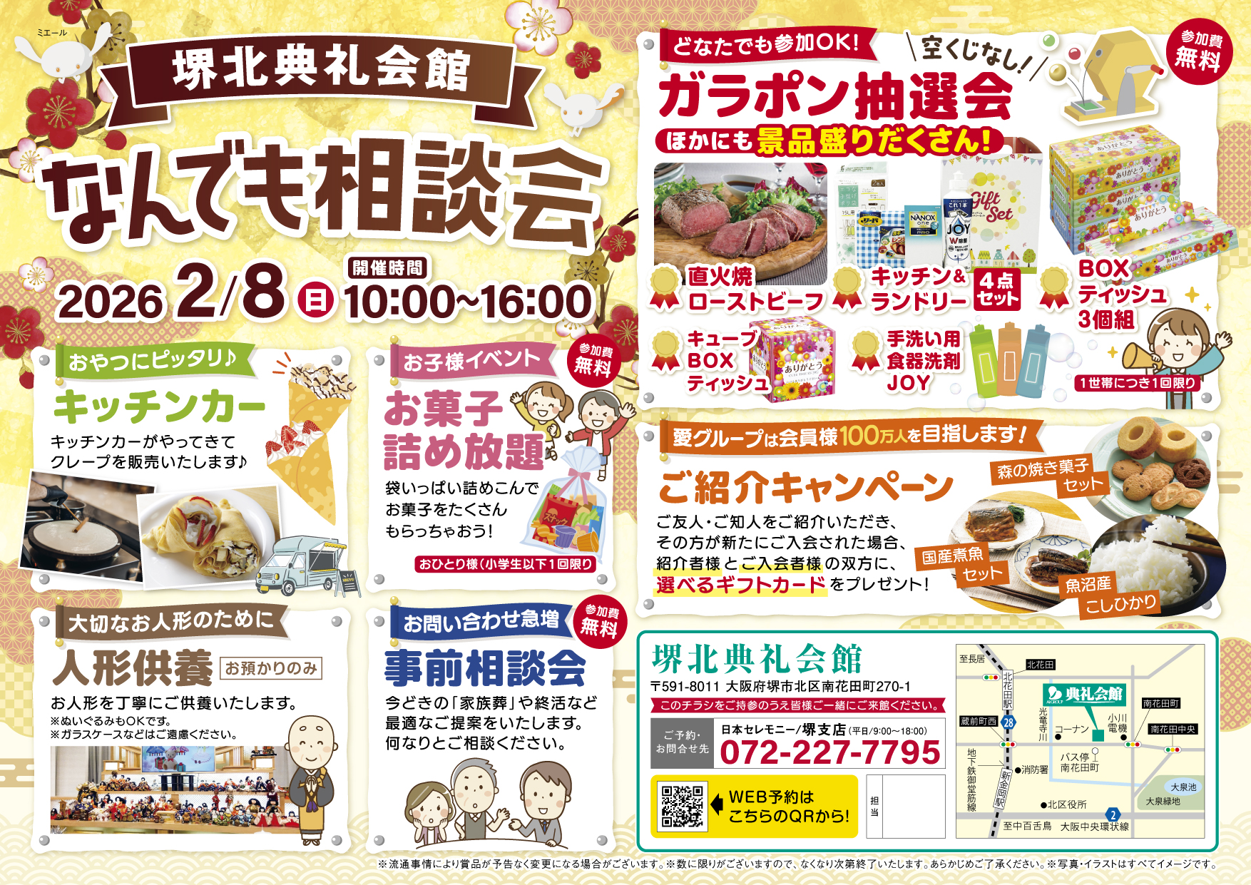2/8(日)10:00~16:00 堺北典礼会館(堺市北区南花田町270-1 TEL072-250-4200) にて
