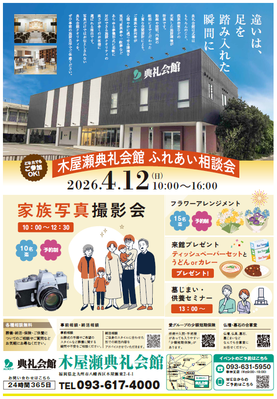 木屋瀬典礼会館(福岡県北九州市八幡西区木屋瀬東2-4-1 TEL093-617-4000) にて『ふれあい相談会』を開催いたします。