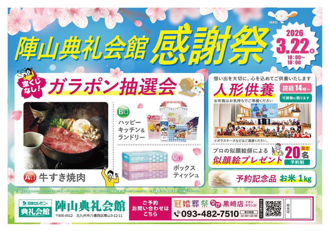 陣山典礼会館(福岡県北九州市八幡西区陣山3-12-11 TEL093-616-0640) にて『感謝祭』を開催いたします。