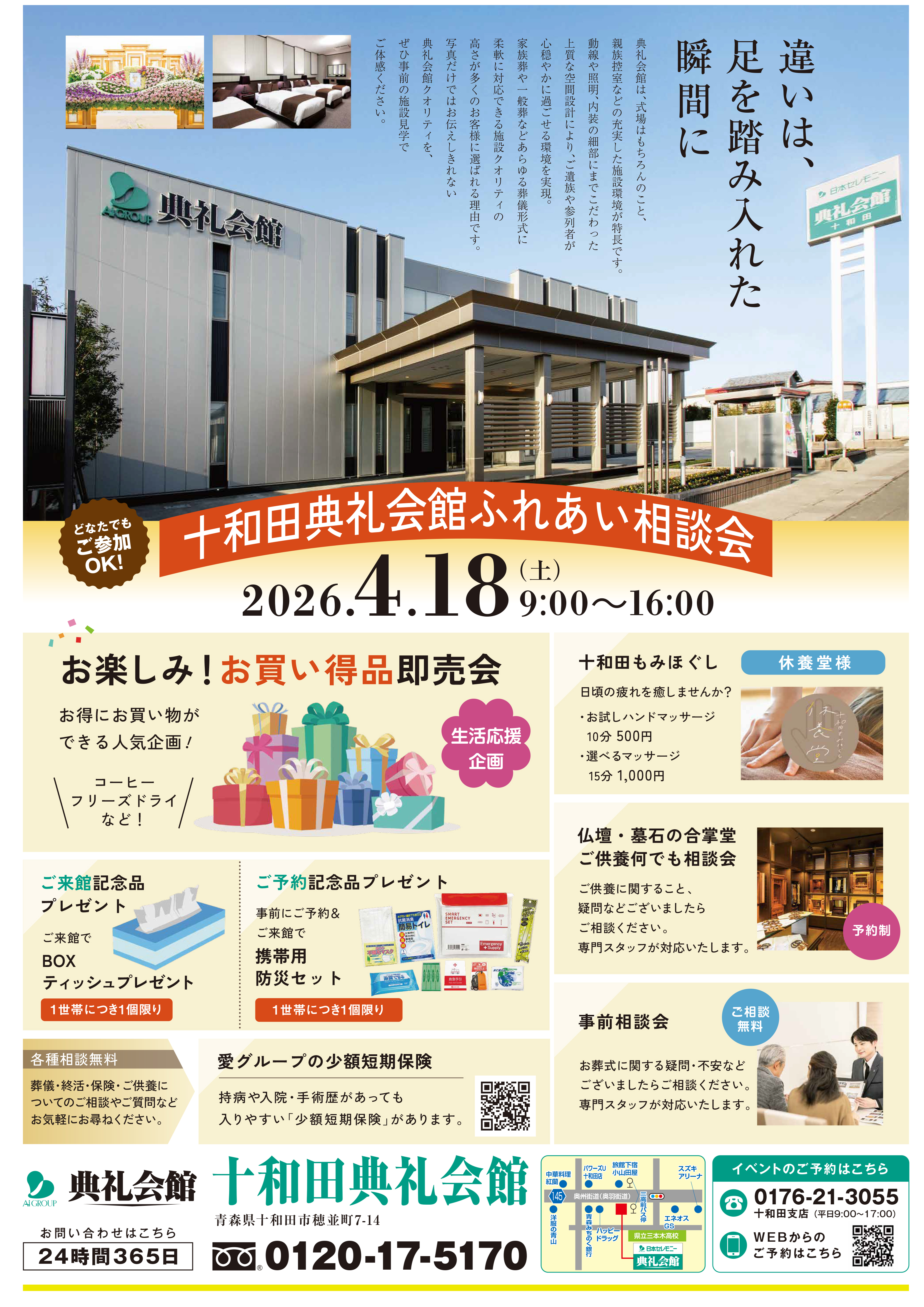 4/18(土)9:00~16:00 十和田典礼会館(十和田市穂並町7-14 TEL0176-21-5560) にて『ふれあい相談会』を開催いたします。